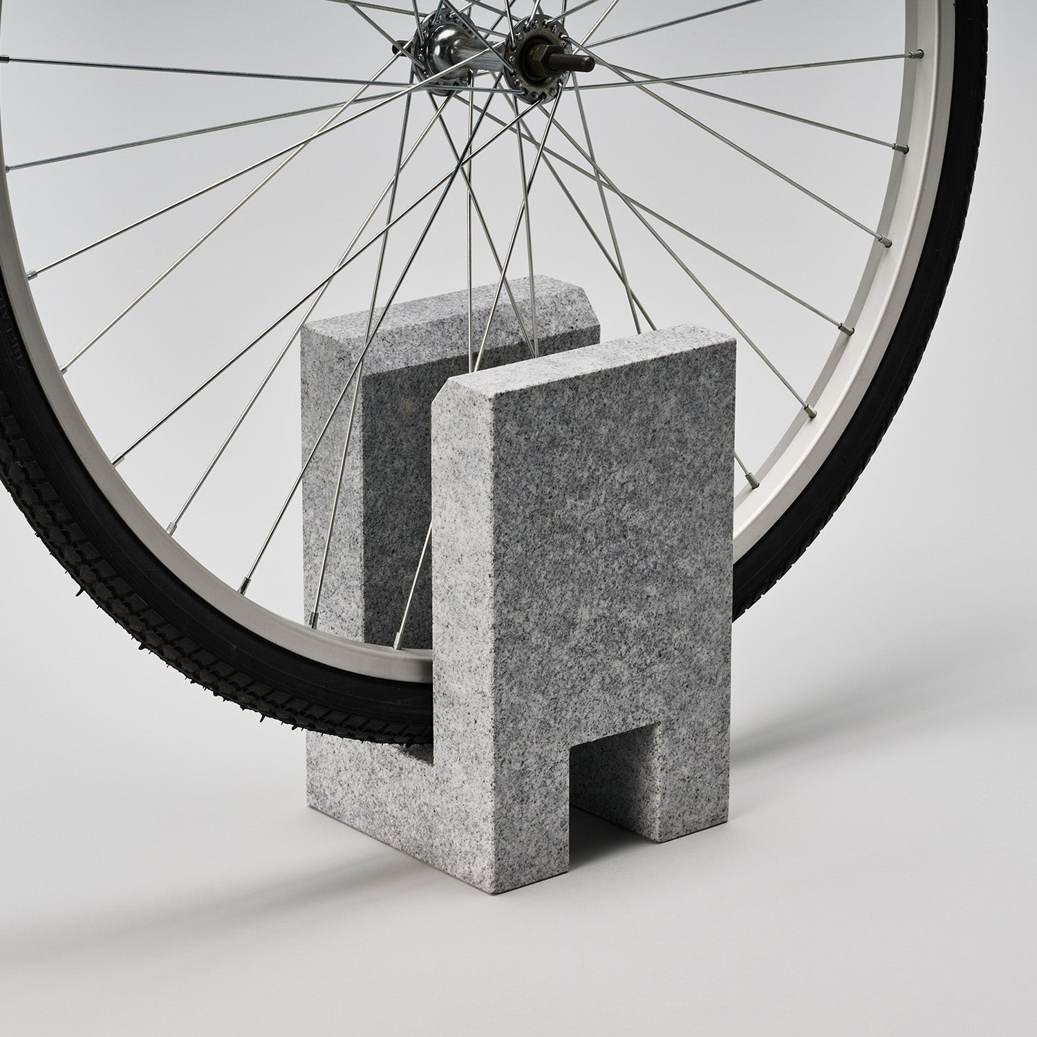 A bicycle stand that utilizes the weight of the stone for stability. Its simple design creates a calm and understated look, allowing it to blend seamlessly into various spaces.
