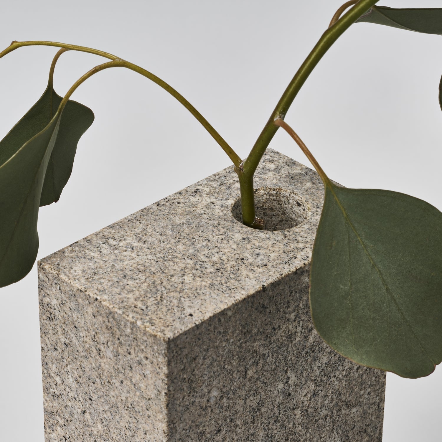 This flower vase looks like a square block of stone. Its mass makes it stable even for tall or voluminous plants.