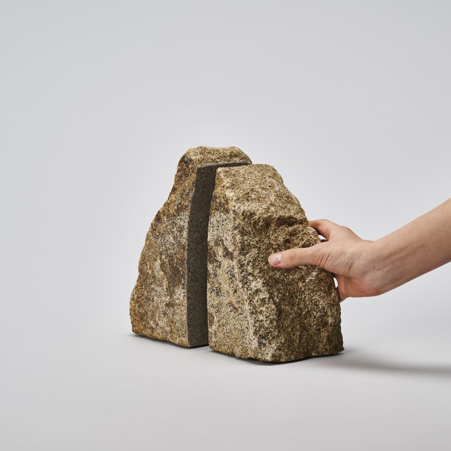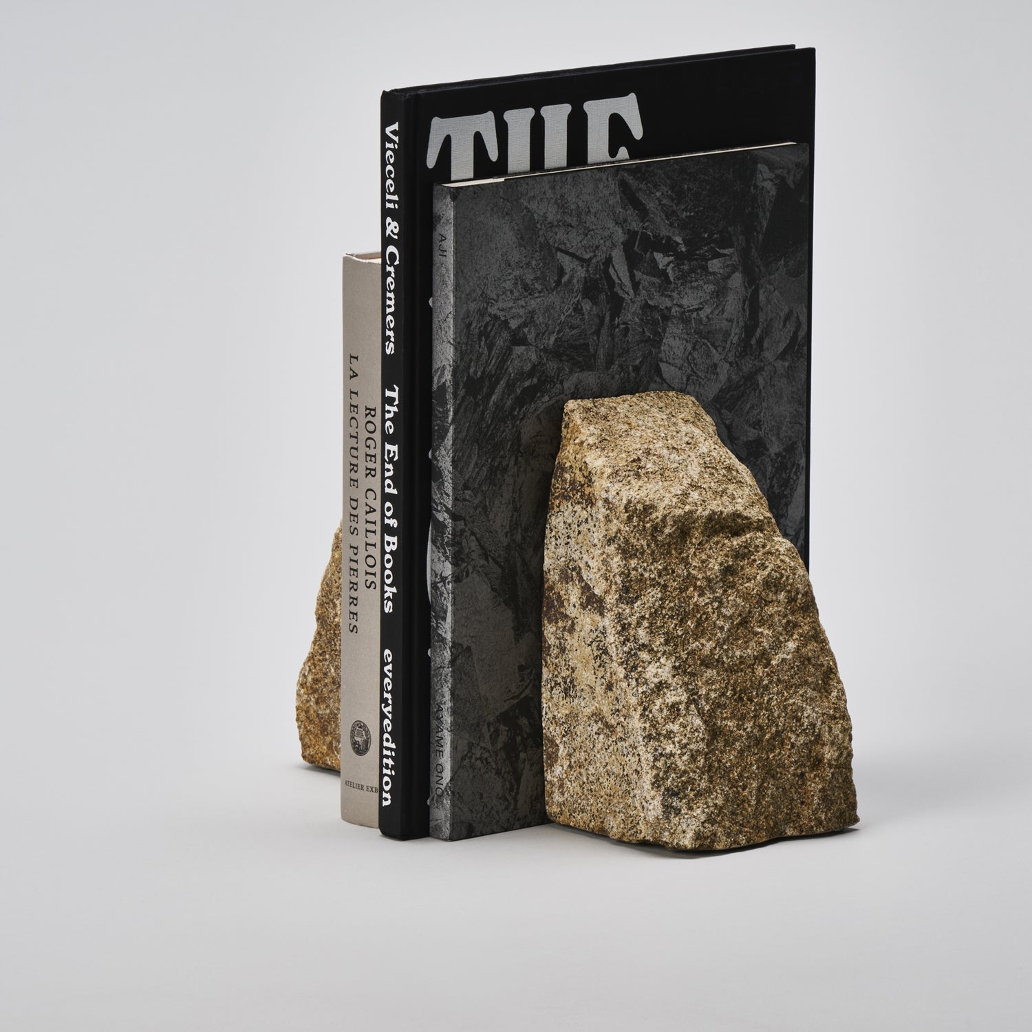 Bookends that take advantage of the natural beauty of stone. Made from one stone that has been split in half, the sides facing the books have been polished so as not to scratch surfaces or damage the books. These stones add an air of natural elegance to any room or study.
