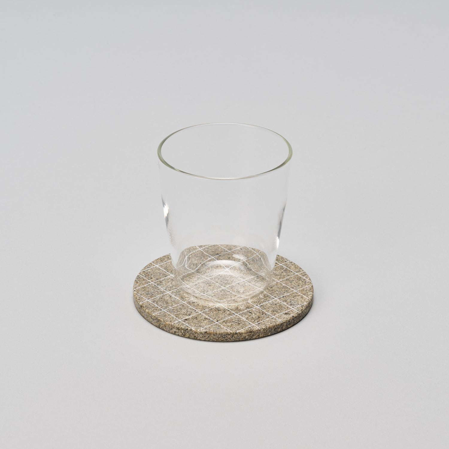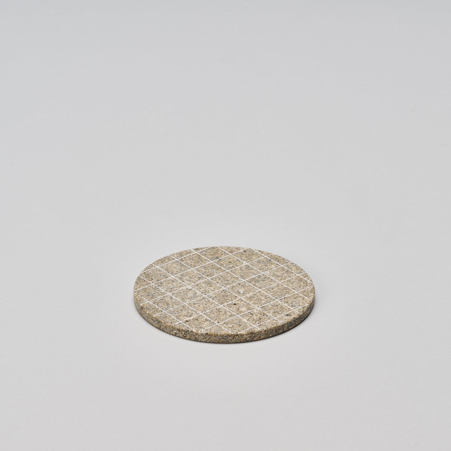 A flat, circular coaster. It can be used to place glasses or cups on it, as well as for holding dry snacks, small items, or as a planter plate. The lines on the surface are engraved using a letter carving technique.