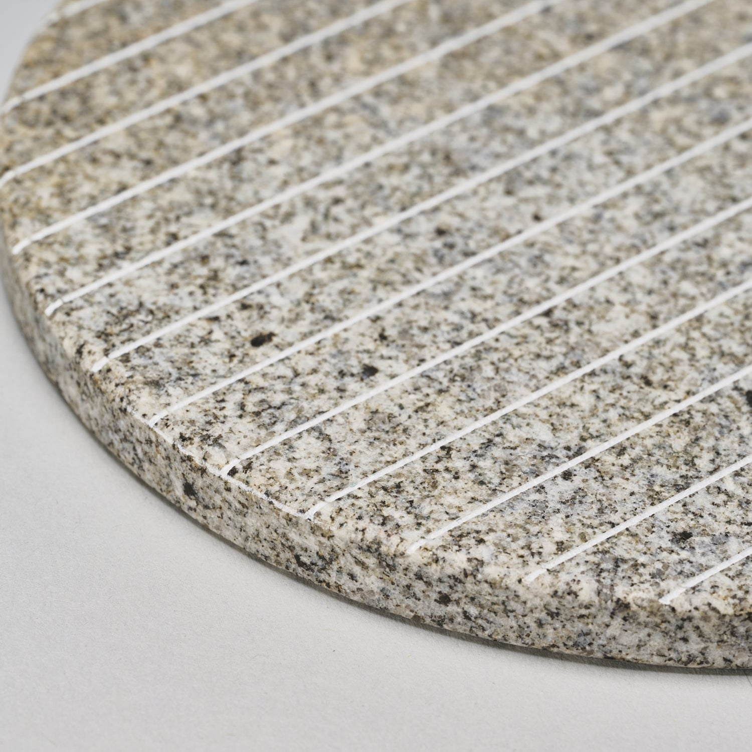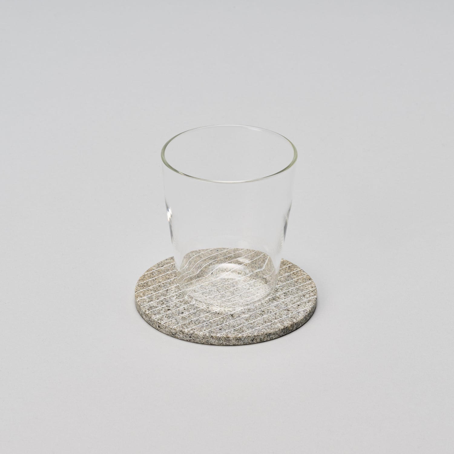 A flat, circular coaster. It can be used to place glasses or cups on it, as well as for holding dry snacks, small items, or as a planter plate. The lines on the surface are engraved using a letter carving technique.